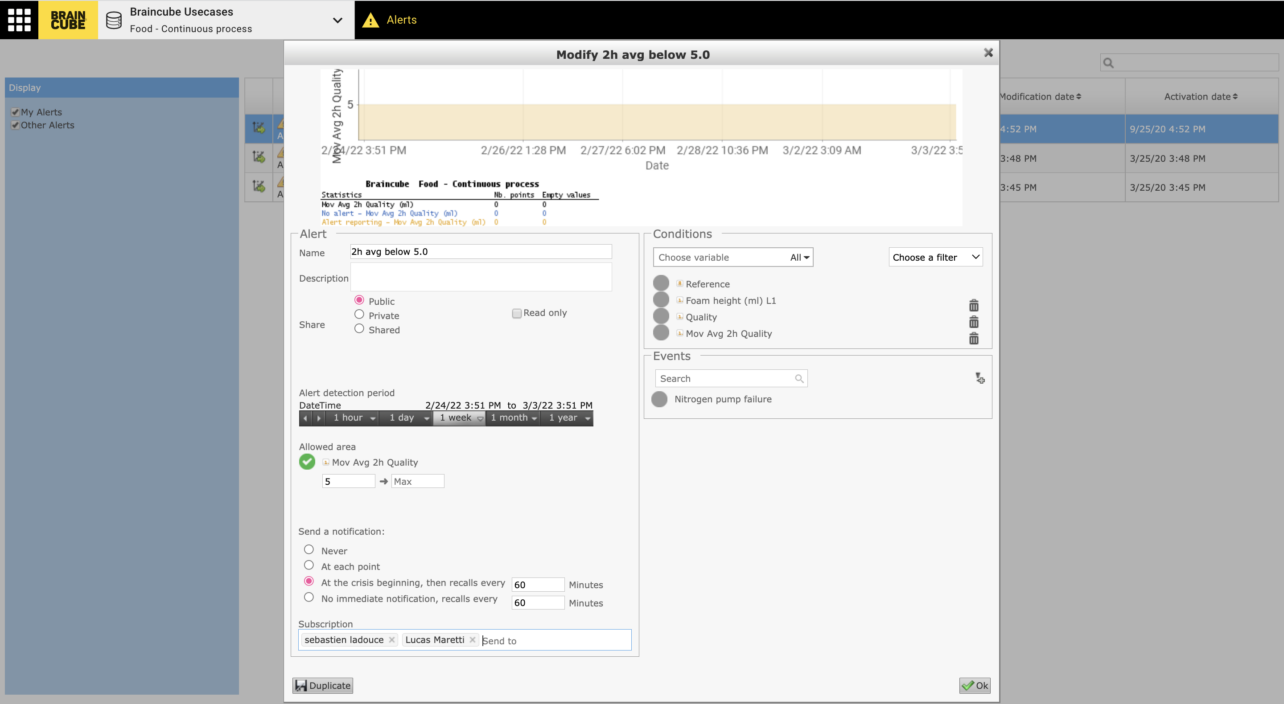For example, the Braincube Alert App notifies operators when current production settings are out of predetermined parameters. You have the flexibility to select the specific conditions you want to be alerted about, along with the alert frequency and method (e.g., email or SMS notification). You can also choose who received those alerts, providing key team members with full visibility to reduce waste and improve efficiency.